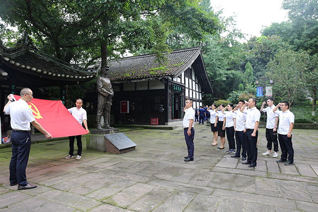 活動(dòng)首先參觀了朱德舊居陳列館,聆聽了朱德在瀘州期間戰(zhàn)斗、生活介紹,深入了解了偉人朱德在瀘州革命的豐功偉績和生平事跡。在朱德銅像前,支部書記黃修華同志帶領(lǐng)下,預(yù)備黨員余洪波同志舉行了入黨宣誓儀式,全體黨員、預(yù)備黨員重溫了入黨誓詞。