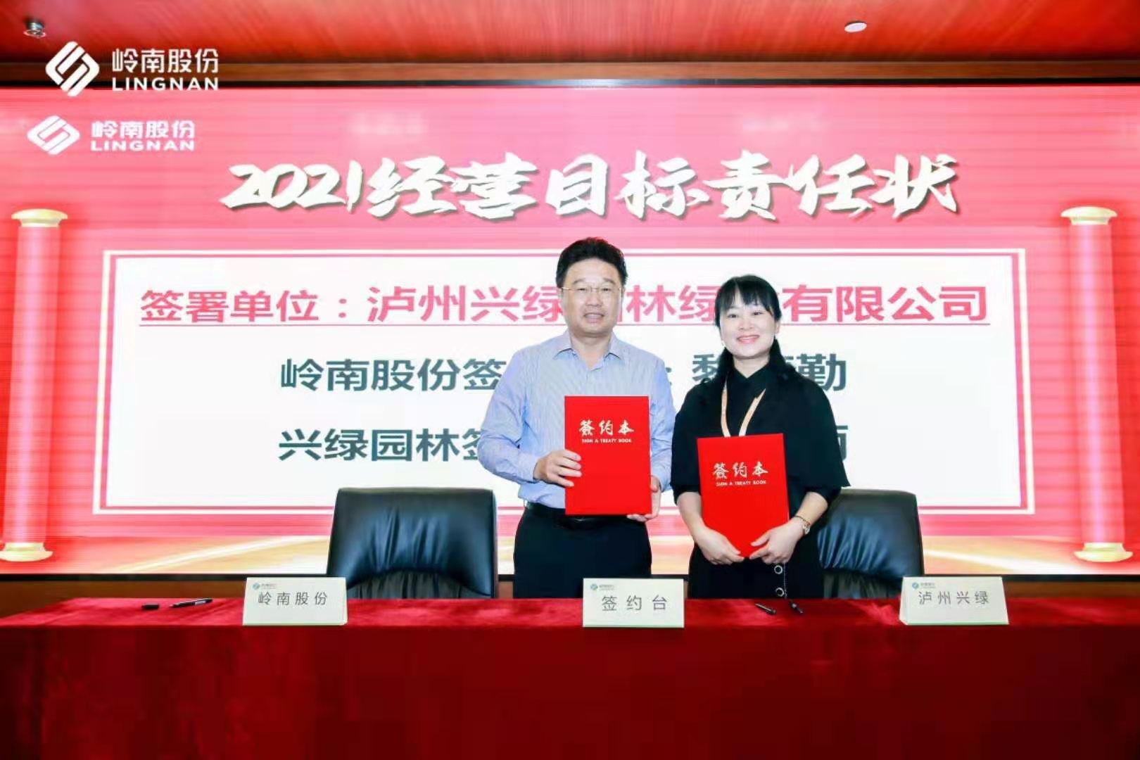 近日,嶺南生態(tài)文旅股份有限公司授予瀘州興綠園林綠化有限責(zé)任公司優(yōu)秀合作商稱號(hào),并簽訂2021年經(jīng)營(yíng)目標(biāo)責(zé)任狀。