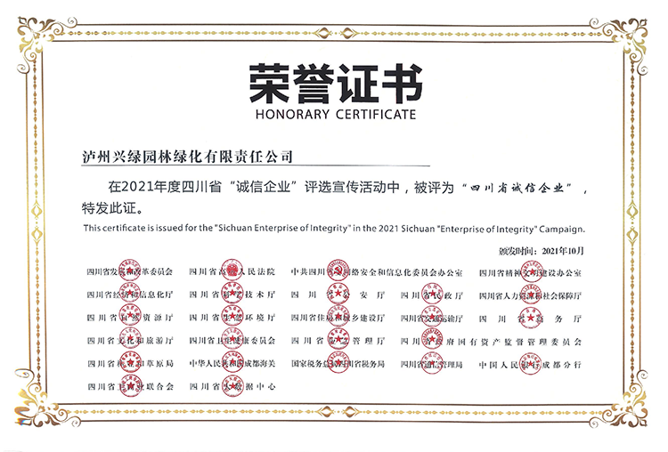 興綠園林公司自成立以來,一直將誠信經(jīng)營作為企業(yè)的立業(yè)之道、興業(yè)之本,堅持依法誠信經(jīng)營,恪守誠信服務(wù)的理念,堅持以誠取信,以信立譽的原則。此次,獲評2021年度“四川省誠信企業(yè)”稱號,是對興綠園林公司堅持誠信經(jīng)營、助推經(jīng)濟發(fā)展、履行社會責(zé)任的充分肯定。興綠園林公司將不斷規(guī)范信用行為,提升信用能力,積累信用價值,打造信用興綠品牌,弘揚誠信文化、普及信用知識,踐行市場經(jīng)濟和現(xiàn)代治理相適應(yīng)的誠信理念、規(guī)則意識、契約精神,全面展示四川“誠信企業(yè)”風(fēng)采。